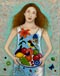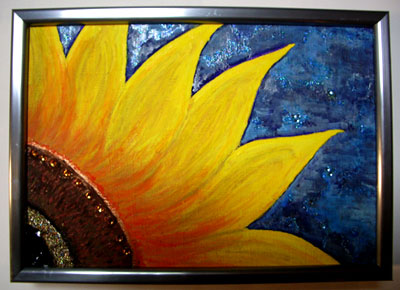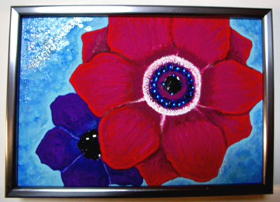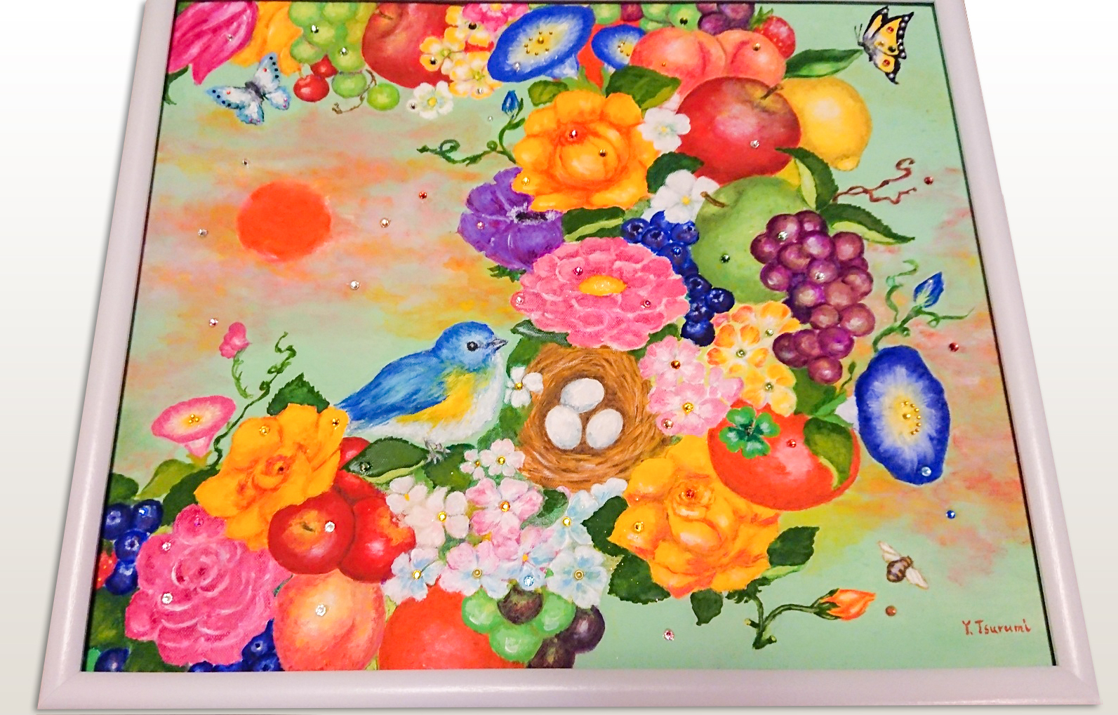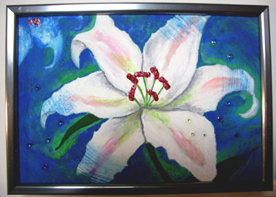 絵の平面にスワロフスキー製のラインストーンやその他のパーツで装飾してみました。
